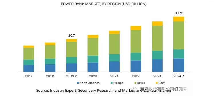 根據國際市場研究機構Markets and Markets本月發布的報告,2019年全球移動電源市場規模預計為107億美元,到2024年將增至179億美元,期間復合年增長率將達到10.8%。